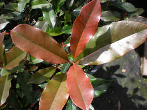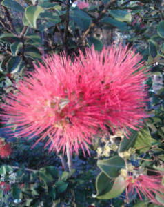 | One of the best feature of Metrosideros Fiji is the brilliant red new growth, as it ages it fades to a glossy red highlighted leaf. It's flowers are very similar to Metrosideros thomasii but are not as numerous and only appear as the plant ages. It loves dry full sun positions and shares the hardiness of the other varieties. They do need pruning to create a dense plant. | |