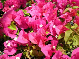 | Bougainvillea's temple fire is the oldest grown dwarf Bougainvillea. It has been used for hybridisation to produce many of the smaller growing Bougainvillea available. In general it will grow to about 500mm in an open growing full sun position, it will grow taller where it is in semi shade especially if it is in amongst other shrubs and trees where it can "lean" on those plants to search for the sun. When grown in full sun it will flower heavily especially in areas of harsh conditions where it puts it's energy into flowering rather than new growth. It has quite small thorns hidden amongst the magenta coloured bract |
